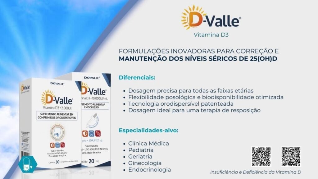 Descubra as formulações inovadoras de D-Valle®, disponíveis em comprimidos orodispersíveis de 2.000 UI (sabor baunilha, sem adição de açúcar, para adultos) e em solução de 10.000 UI/mL (com dosagem precisa via gotejador, para uso pediátrico e adulto). Encontre a flexibilidade e a alta biodisponibilidade que otimizam a terapia de suplementação. Ache especialidades como Clínica Médica, Pediatria, Geriatria, Ginecologia e Endocrinologia, tudo pela Nutrafarm Distribuidora, sua parceira de confiança em saúde!