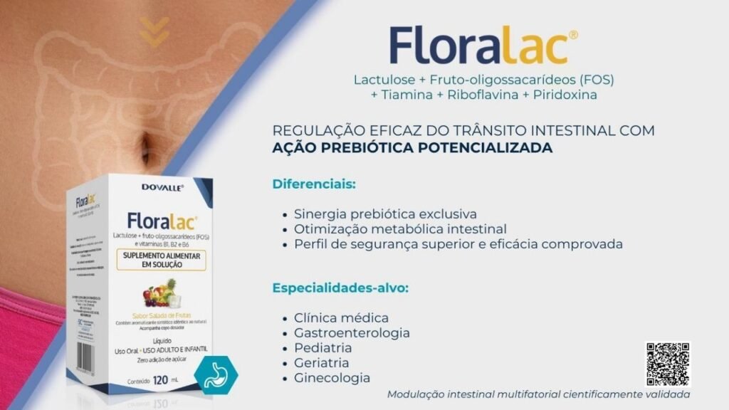 Combina Lactulose, FOS e vitaminas B1, B2 e B6, promovendo uma modulação intestinal multifatorial e cientificamente validada. Com sabor delicioso de salada de frutas e sem adição de açúcar, é perfeito para adultos e crianças. Encontre em Floralac® um produto com exclusiva sinergia prebiótica e superior perfil de segurança, ideal para Clínica Médica, Gastroenterologia, Pediatria, Geriatria e Ginecologia. Ache essa solução de alta qualidade e outros produtos essenciais para sua farmácia ou clínica através da Nutrafarm Distribuidora.