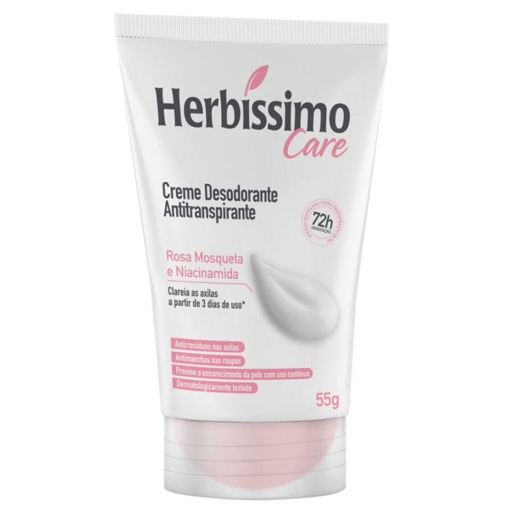 Conheça o Herbíssimo Care Creme Desodorante Antitranspirante! Ele é bom para oferecer 72 horas de proteção contra o suor e o mau odor. Sua fórmula especial, com Rosa Mosqueta e Niacinamida, é ideal para clarear as axilas a partir de 3 dias de uso, além de ser anti-resíduo, anti-manchas nas roupas e prevenir o escurecimento contínuo da pele. Ideal para quem busca uma proteção eficaz aliada a um cuidado avançado para axilas mais claras e saudáveis. Você encontra este produto na Nutrafarm Distribuidora.