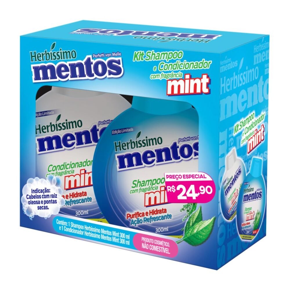 Conheça o Kit Herbíssimo Mentos Mint! Ele é bom para proporcionar uma limpeza profunda e um frescor revigorante aos seus cabelos. Este kit exclusivo contém 1 shampoo e 1 condicionador de 300ml cada, com a fragrância refrescante da menta Mentos, ideal para quem tem raízes oleosas e pontas secas. O shampoo oferece purificação e hidratação, enquanto o condicionador complementa o cuidado, equilibrando a oleosidade e deixando os fios leves e hidratados. Desfrute de uma experiência refrescante e de cabelos limpos e saudáveis! Uma edição limitada para um cuidado capilar cheio de frescor! Lembre-se: produto cosmético, não comestível. Você encontra este produto na Nutrafarm Distribuidora.
