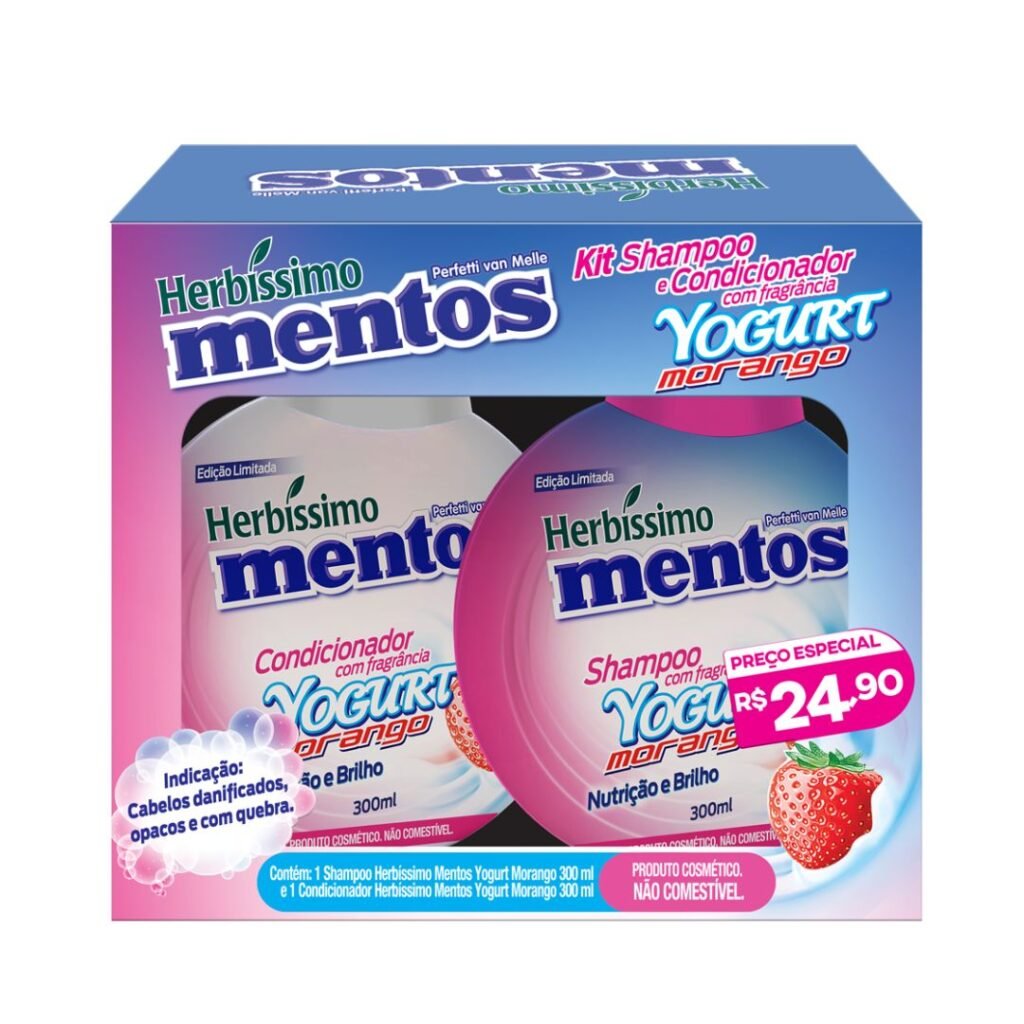 Nutrição e Brilho com Sabor de Morango: Herbíssimo Mentos Yogurt Morango! Conheça o Kit Herbíssimo Mentos Yogurt Morango! Ele é bom para revitalizar seus cabelos, oferecendo nutrição intensa e brilho radiante. Inspirado no delicioso sabor de Mentos de iogurte e morango, este kit traz 1 shampoo e 1 condicionador de 300ml cada, formulados para cabelos danificados, opacos ou com quebra. Com uma fragrância irresistível, o kit ajuda a devolver a vida aos fios, deixando-os mais saudáveis, macios e luminosos. Uma edição limitada para um cuidado capilar cheio de sabor! Lembre-se: produto cosmético, não comestível. Você encontra este produto na Nutrafarm Distribuidora.