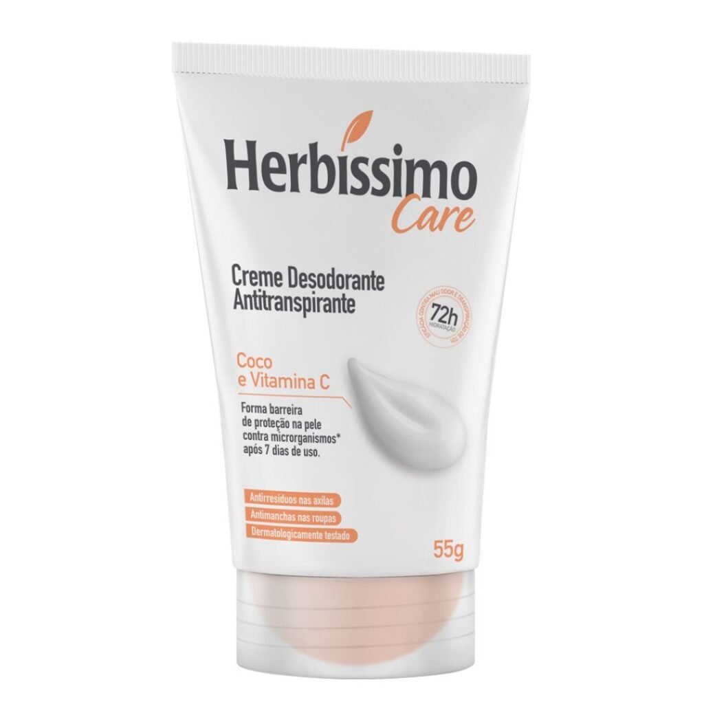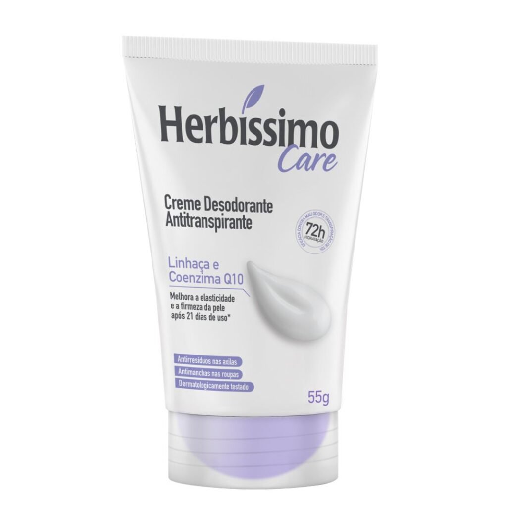 Conheça o Herbíssimo Care Creme Desodorante Antitranspirante! Ele é bom para oferecer 72 horas de proteção contra o suor e o mau odor, mantendo suas axilas secas e protegidas. Sua fórmula inovadora, enriquecida com Linhaça e Coenzima Q10, vai além, ajudando a melhorar a elasticidade e firmeza da pele em apenas 21 dias. Ideal para quem busca um cuidado completo, com um produto anti-resíduo, anti-manchas em suas roupas e dermatologicamente testado. Você encontra este produto na Nutrafarm Distribuidora.