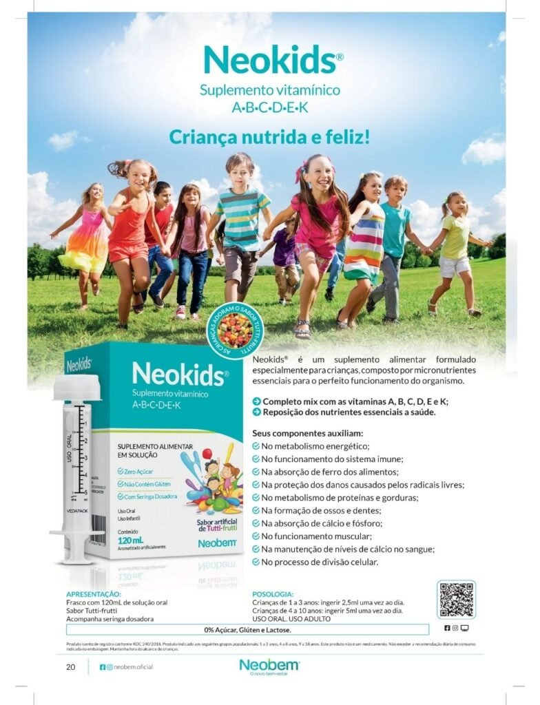 Descubra o Neokids, desenvolvido para apoiar o crescimento e a saúde das crianças com uma mistura essencial de vitaminas A, B, C, D, E e K. Proporcione energia e bem-estar aos pequenos de forma saborosa e nutritiva. Onde encontrar? Na Nutrafarm Distribuidora, sua parceira em saúde infantil.
