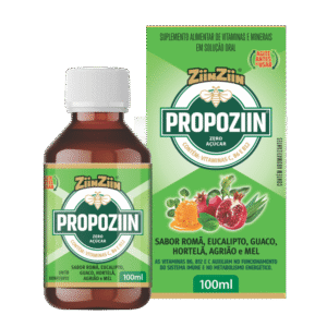 ZiinZiin Propoziin é um suplemento líquido com própolis, mel, romã, eucalipto, guaco, hortelã e agrião, enriquecido com vitaminas C, B6 e B12. Zero açúcar, prático para o dia a dia e aliado da imunidade. Encontre na Nutrafarm Distribuidora e cuide da sua saúde!